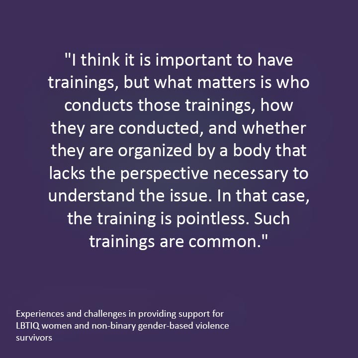 - 72,7 % of organisations highlight lack of knowledge on how to approach LBTIQ women and non-binary persons as their biggest challenge