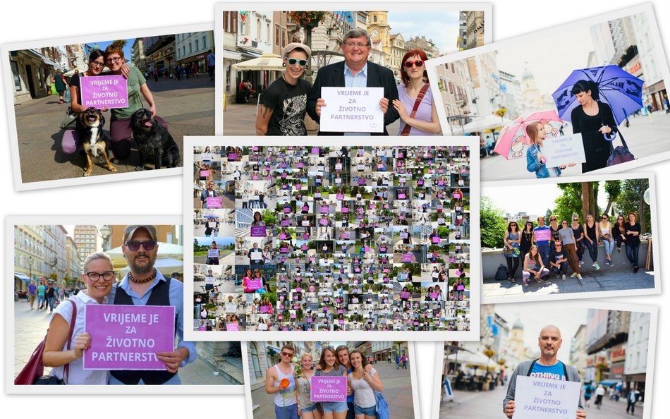 Nepunih mjesec dana kasnije, također u okviru navedene inicijative, u Rijeci je organizirana akcija fotografiranja. U dva dana na Korzu i trsatskom kampusu više od 300 Riječanki i Riječana slikalo se s natpisom „Vrijeme je za životno partnerstvo!“. Nadamo se da ste bili/e među njima; Obersnel i Urban jesu. Zakon je izglasan 15. srpnja, nažalost istovremeno sa Zakonom o radu. Donošenje Zakona o životnom partnerstvu svečano je proslavljeno u „Tunelu“, a donošenje onoga o radu nismo imali/e razloga slaviti.
