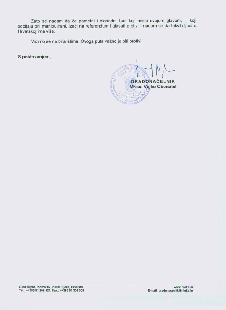 Prenosimo vam pismo podrške našeg gradonačelnika Vojka Obersnela te njegove stavove o referendumu: